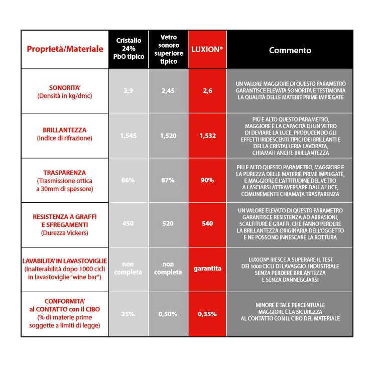 Il Luxion® è il vetro sonoro superiore brevettato da RCR, riciclabile all'infinito. L'utilizzo di ossidi nobili all'interno della formula del materiale garantisce un alto livello qualitativo visibile a occhio nudo e riscontrabile nella resistenza, trasparenza, brillantezza e sonorità dei prodotti. Estremamente resistente, è pensato per un utilizzo professionale e casalingo, e lavabile in lavastoviglie.